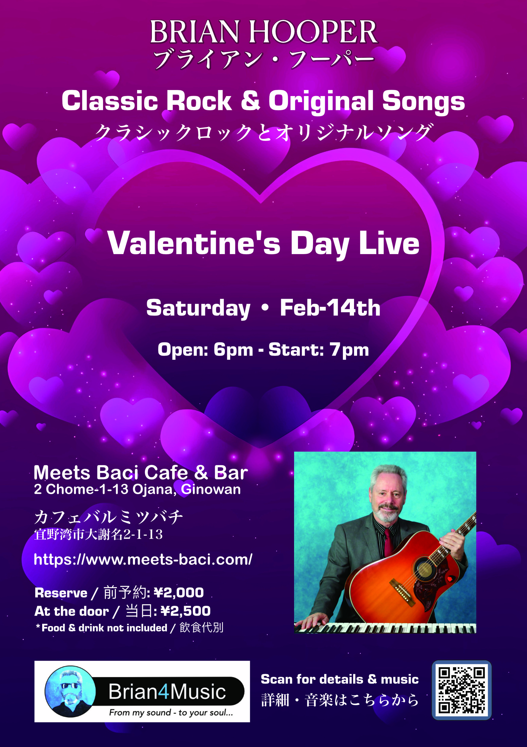 | 料金 | ★前予約2,000円(税込) [ 飲食代は別途 ] ★ 当日2,500円(税込) [ 飲食代は別途 ] *席数に限りがございますので、予約制となっております。予めご了承下さいませ。 お問合せ先 予約メール brian4music.info@gmail.com もしくは、098-988-4638 (カフェバル ミツバチ) |